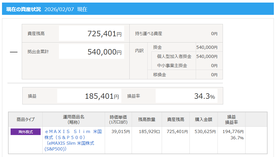 ちなみに、こちらが現在のiDeCo(SBI証券)の資産状況です。
