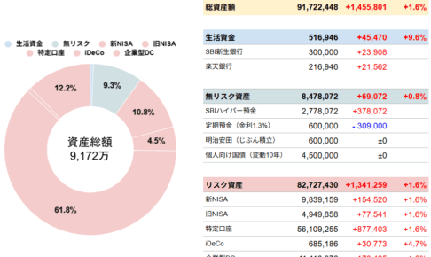 10月末の資産状況を確認したいと思います。 資産額が大台突破 総資産額は大台を突破し、9,026万円となりました。先月末比+446万円で、今までずっと資産推移の記録を取っていますが、過去最高の増額幅です。 資産内訳 資産…